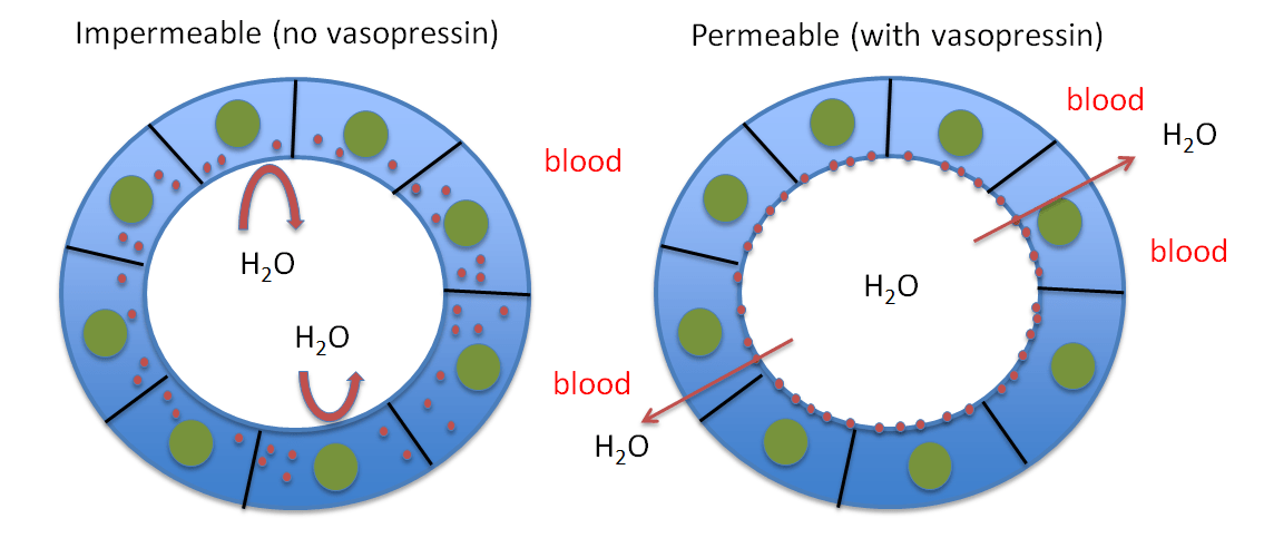 The kidneys are responsible for determining how much water is expelled from the body through urine, and how much is retained for use within the body. Water channels help to move water from the bloodstream to the bladder, and an anti-diuretic hormone called vasopressin prompts the water channels to move from the center of the cell to the outside to allow water through.